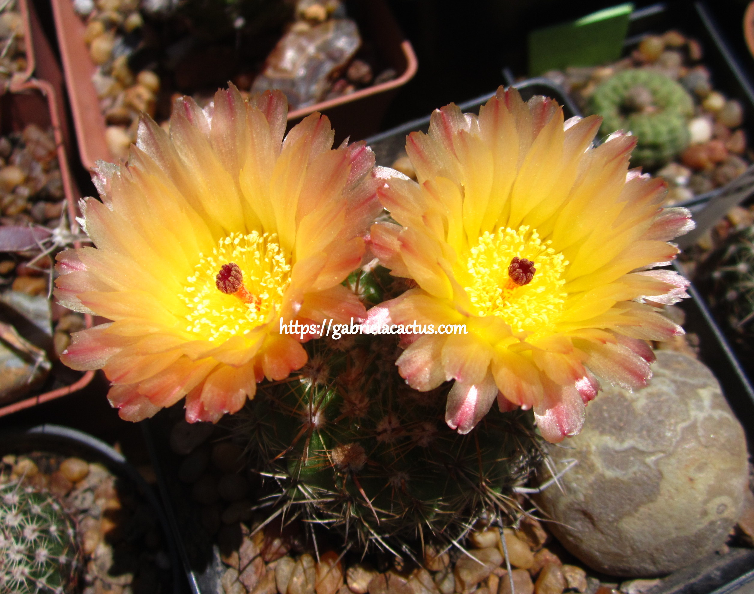 Otro rasgo en común con el N. herteri reside en la disposición de las costillas, que están dispuestas en espiral, se aprecia más en notocactus de tamaño pequeño. Es un cactus que florece en edad temprana, cuando llega a tener de diámetro unos 8 a 9 cm. Las flores como ya dijimos son rosadas y amarillas. satinadas, grandes que llegan a medir hasta 8 cm. de diámetro.